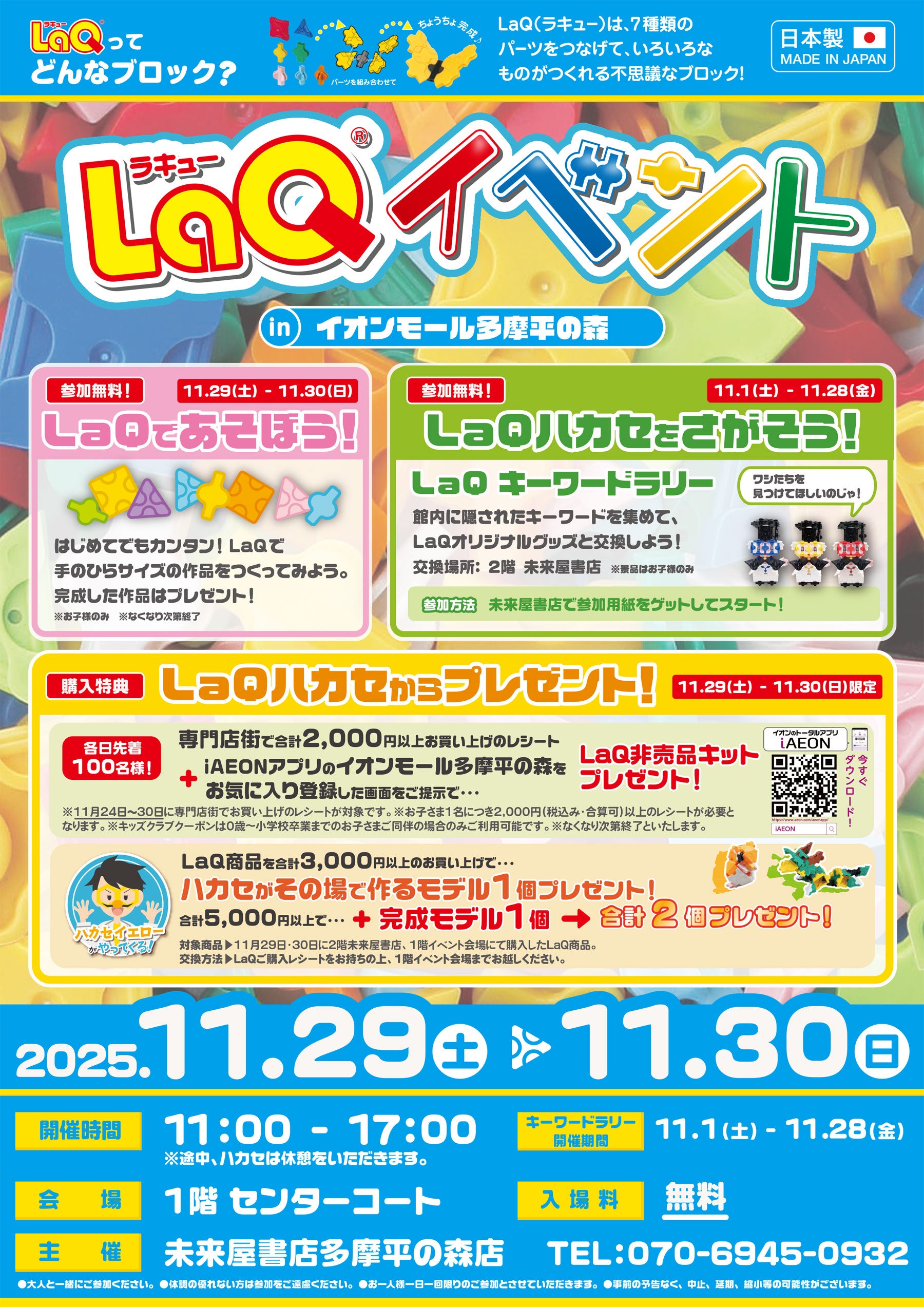対象商品⇒11/29・30に2F未来屋書店、1Fイベント会場にて購入したLaQ商品。